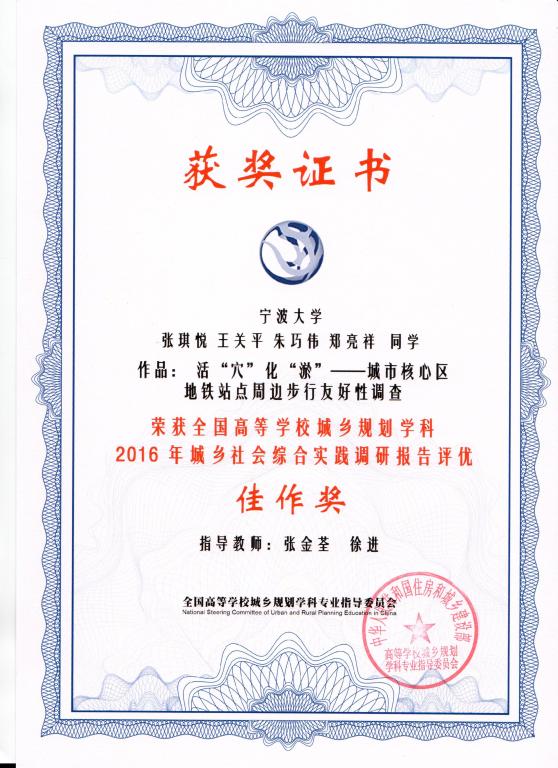 城乡规划专业12级的多位同学在学院领导的大力支持和专业老师的悉心指导下,凭着积极刻苦的态度和热情投入的工作,提交了“城市设计课程作业”、“城乡社会综合实践调研报告课程作业”和“城市交通创新出行实践报告”各一份参加本次竞赛。其中,城市设计和城乡社会综合实践调研报告课程作业在竞赛中创下佳绩,获得了两项佳作奖,分别是:郑铄、王晓黎的《江河旧圩、学贾新市》,荣获城市设计课程作业佳作奖(指导教师:王聿丽、陈芳、潘钰、徐进);张琪悦、王关平、朱巧伟、郑亮祥的《活“穴”化“淤“——城市核心区地铁站点周边步行友好性调查》,荣获社会调研报告佳作奖(指导教师:张金荃、徐进)。