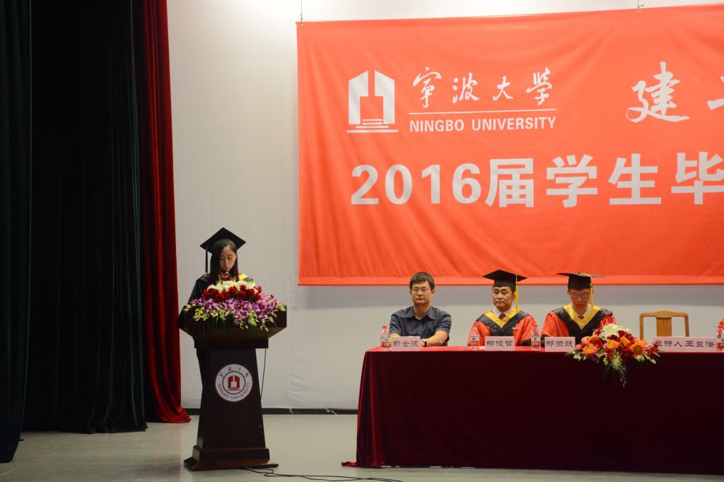 全体起立,在雄壮的国歌声中拉开了此次毕业典礼的序幕。首先由院党委副书记俞金波老师宣读2016届优秀毕业生表彰名单,并简单介绍了毕业生情况。接着毕业生代表方遥越同学作了发言,回忆了大学年华,同时感叹时光流逝之快,也表达了广大毕业生对未来的美好憧憬,表达了对母校、对学院、对老师的感恩和祝愿。之后郑荣跃院长致毕业贺词,郑院长向学业有成、即将告别母校、踏上新的人生征途的毕业生表示最热烈的祝贺,并希望同学们永怀理想之心,不负桑梓情,书写自己的人生新篇章。