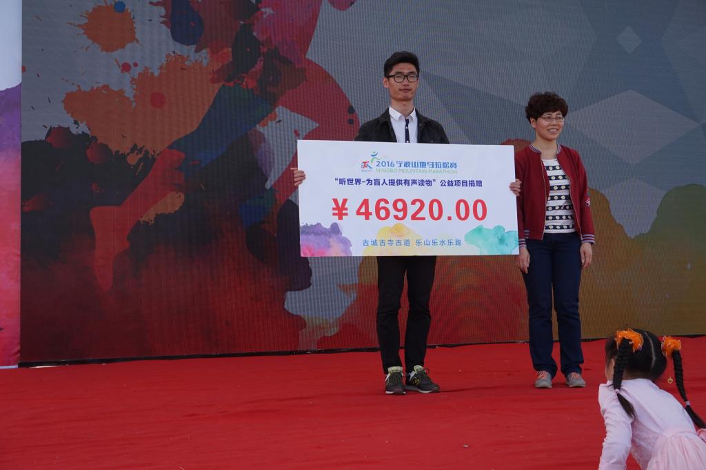 “听世界——为盲人提供有声读物”公益项目以高达59%的投票率胜出。主办者从参赛运动员报名费用里提取出每人10元费用,支持公益项目的开展,将每一份小爱汇聚,成为一份大爱,为需要的人群提供力所能及的帮助。在颁奖仪式上进行了公益项目捐赠仪式,江北区民政局局长林幼红为“听世界”项目组颁发46920元的公益基金。