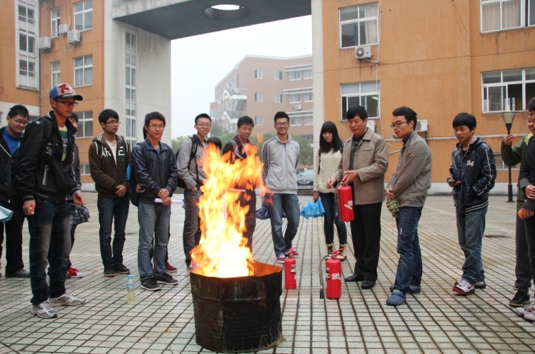 讲座中,学工办俞一统老师先和同学们讲解了在校生活,尤其是寝室中的安全隐患,并引用过去的实例让同学们再次深刻了解其重要性。随后,保卫处徐作义老师给大家讲解了火灾发生时的应对措施,并演示了干粉灭火器的使用方法。