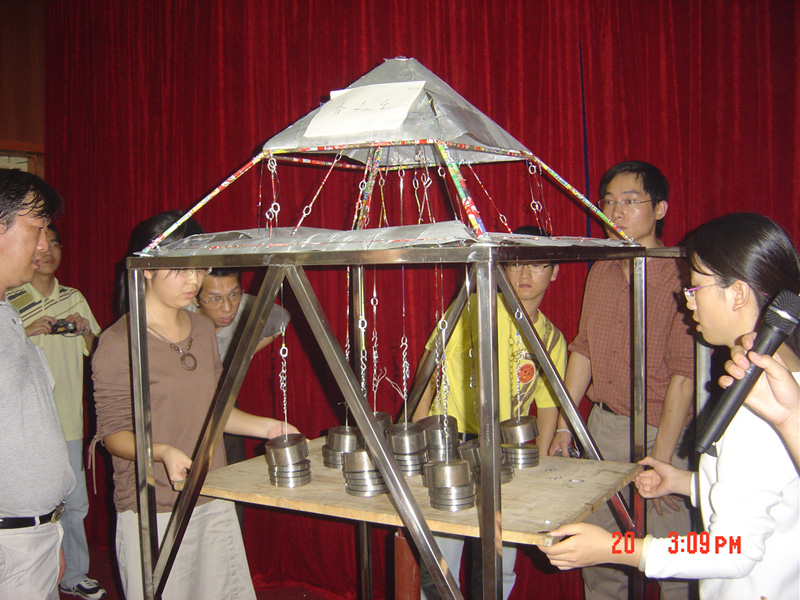 此次竞赛内容是要求每个参赛队设计和制作一个屋盖模型,并首次规定使用 “易拉罐”材料进行制作。经过一个多月的精心准备,由专家组进行初评后,选出21件作品参加了20日的决赛。最后经过专家组成员从造型、结构方案、理论分析、制作工艺、叙述答辩和实验加载等六个方面的综合考核、评定,评选产生了一等奖1名,二等奖2名,三等奖四名,并推选出了下月参加全省总决赛的参赛作品。