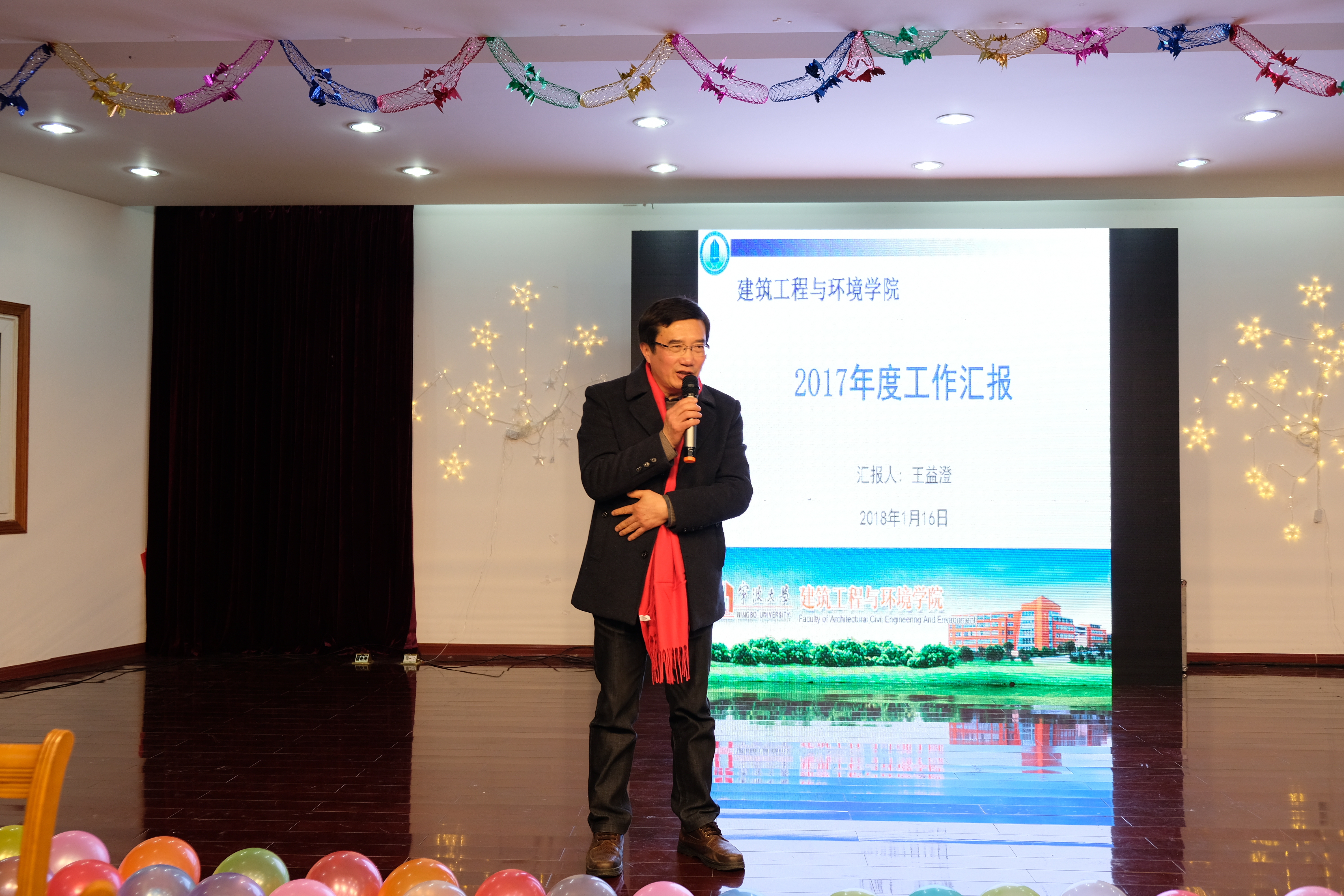 学院党委书记王益澄首先致开场辞。他向全院教职工表达了节日的问候和美好的祝愿,并简要回顾了2017年学院各项工作所取得的成果,同时对今年刚退休的原地理系教师杨晓平致以诚致的祝福。