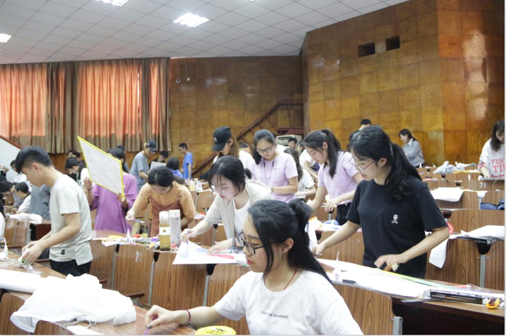 上午10:30,风筝赛制作讲解在建工学院报告厅举行,结构协会会长陈家乐为参赛选手细致地讲解风筝的制作过程——取材、设计骨架、扎骨架、糊纸蒙面并上色、加提脚线以及放飞线和提线的连接。下午13:00,风筝制作比赛在阶二正式开始。参赛人员以2-4人为一组的形式制作风筝,经过2小时左右辛苦制作,风筝基本完成,然后各组为风筝上色,并写上祝福,在风筝上画上各种精美图案,或者根据风筝的形状设计了卡通形象。下午15:00,选手和工作人员集体去大草坪放飞风筝,选手们纷纷尝试将自己亲手做的风筝放飞起来,在场的工作人员记录能放飞的风筝以及它们的高度。
