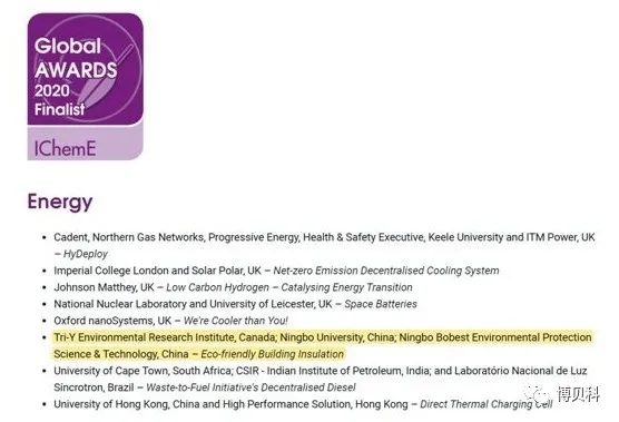 2020年9月14日,英国化学工程师协会 (The Institution of Chemical Engineers, IChemE) 公布了2020年度全球奖入围优胜获奖名单 (IChemE Global Awards 2020 Finalists),绿色建筑保温材料 (Eco-friendly Building Insulation) 获得能源奖项 (Energy Award), 奖项合作单位为:加拿大查韦环境研究院;sm调教 ;宁波博贝科环保科技有限公司