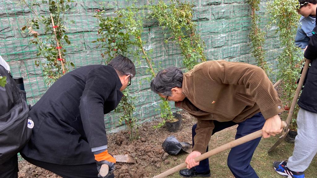3月12日上午,sm调教 50名师生在校园内共同种下月季、蔷薇等30余株绿植,一道绿荫长墙瞬间为校园增添了一抹亮丽色彩。