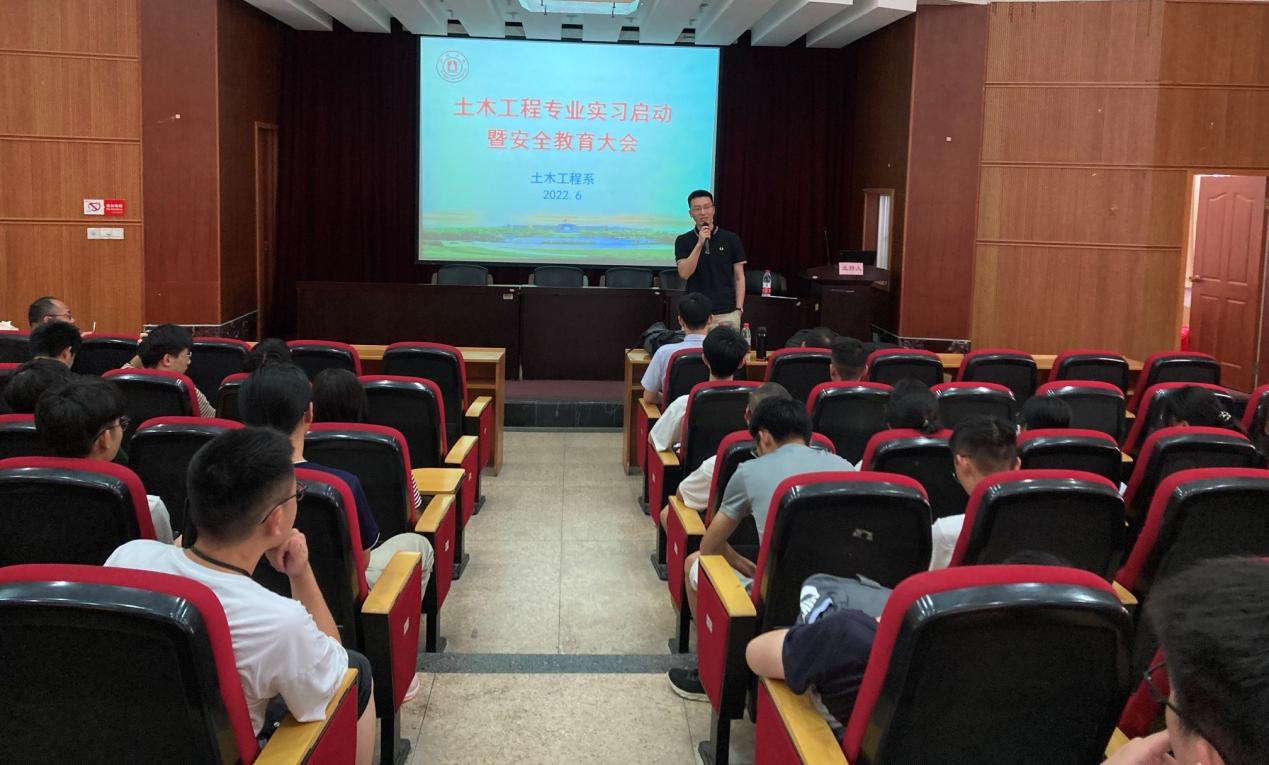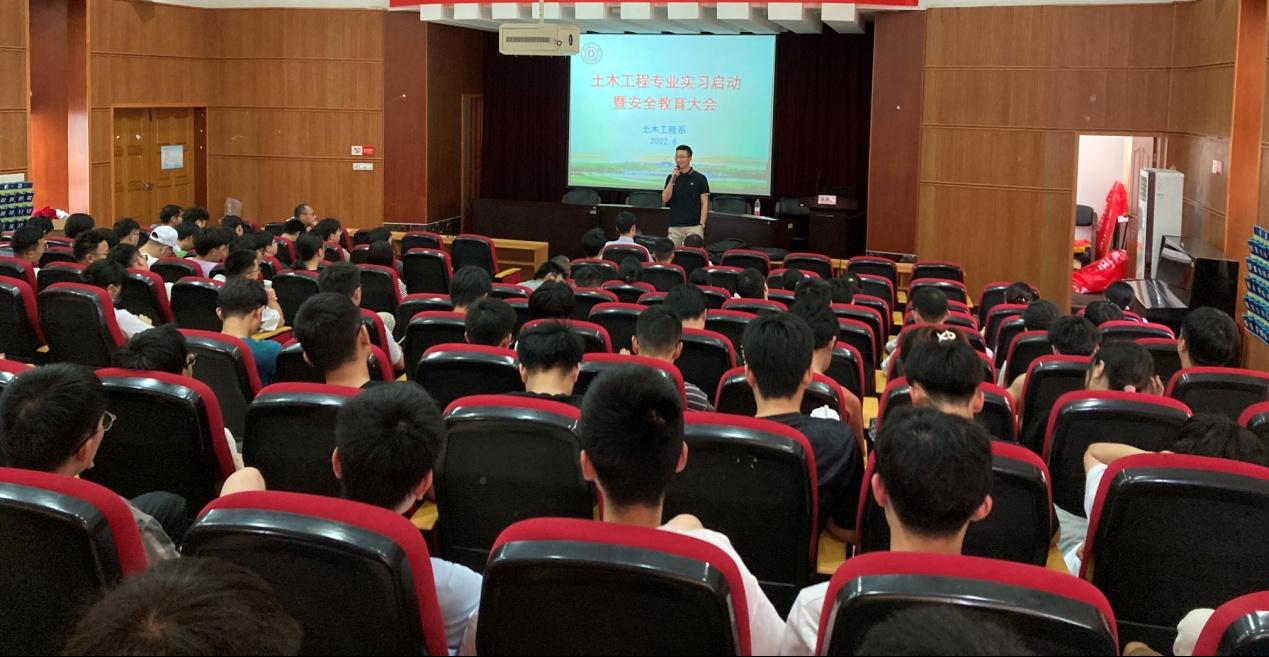 6月28日,土木工程系在学院一楼报告厅举行专业实习启动仪式暨安全教育大会,学院党委副书记朱剑琼、党委委员章子华、土木系主任贺智敏及实习带队老师出席本次大会。