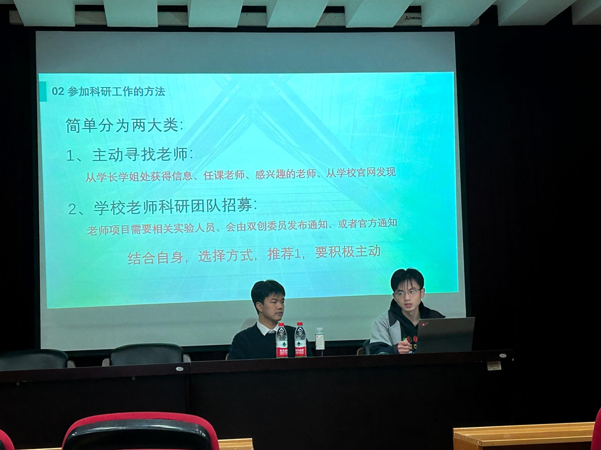 19级阳明创新2班工程管理专业曹家彰学长主要从他自己的第一篇英文论文的撰写过程出发,从论文课题的实验过程中告诉学弟学妹们在科研当中需要注意细节,需要保持耐心和毅力。在数据处理和论文撰写的过程中,他告诉我们需要注意论文阅读量的积累,推荐了Origin作为画图的软件,Zotero作为文献处理和归纳的工具,为学弟学妹们做了科研基础的启迪。19级土木工程2班易昕政学长主要从为什么想做科研以及如何开始科研的角度出发,跟同学们讲做科研需要做好的准备。科研是一项不易的事情,他还提到,最重要的是要有责任心和保持耐心,自己要有高度的精神状态与充沛的责任心,失败是常有的事,唯有坚持才能取得成果。