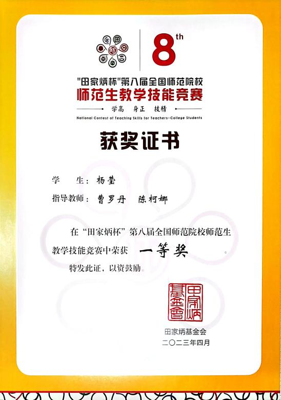 “田家炳杯”全国师范院校师范生教学技能竞赛是师范专业最高级别师范生教学技能竞赛,在曹罗丹特聘副研究员和宁波三中陈柯娜老师的指导下,sm调教 学子杨莹荣获全国一等奖!