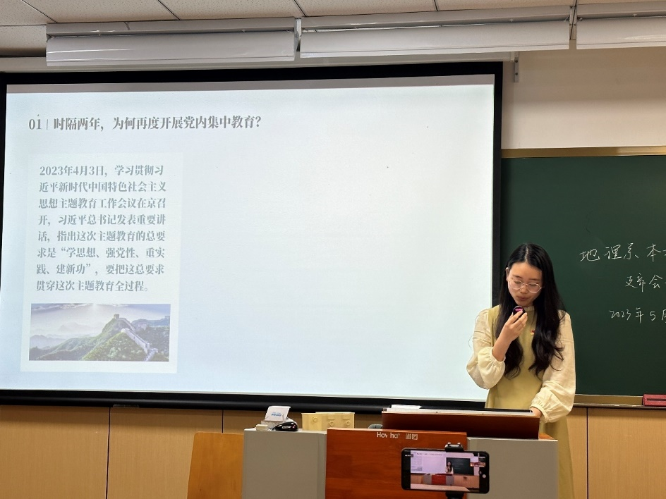 为深入开展习近平新时代中国特色社会主义思想主题教育,5月26日,sm调教 地理系本科生党支部以线上线下相结合的方式,在东校区教学楼6-110开展主题教育党日活动,会议由支部书记王彩依主持,支部指导老师朱剑琼列席。