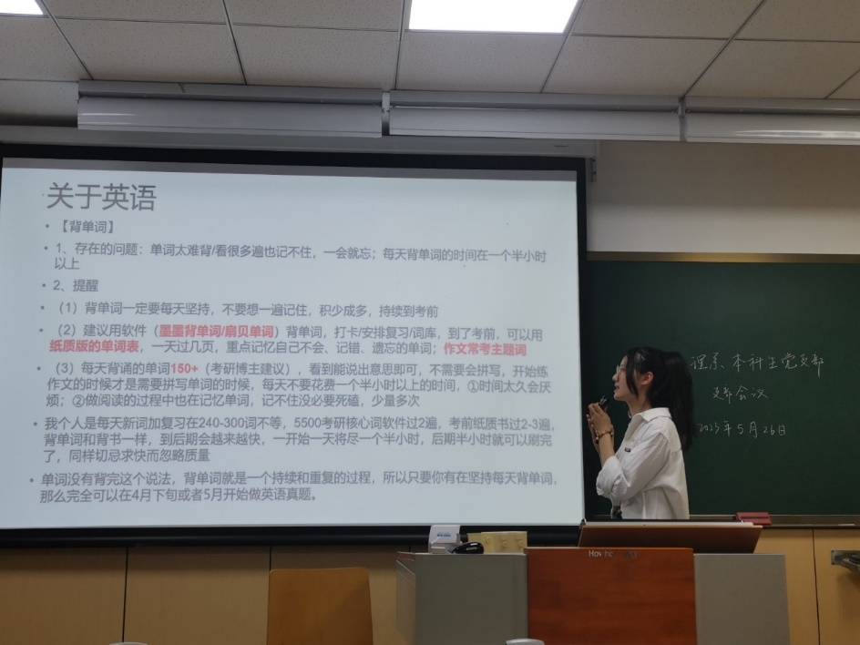 随后,为了更好地帮扶低年级同学备考研究生,支部开展考研经验分享会,邀请支部党员蒋雨琦(23考研本校学科教学(地理)第一)和陈博阳(23考研本校地理学第一)主讲。