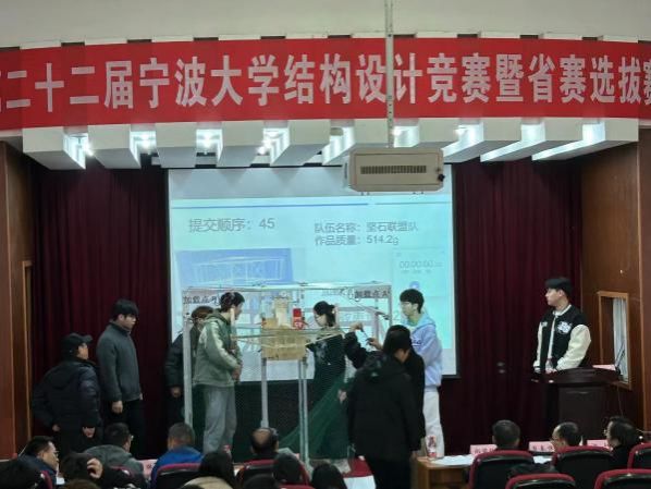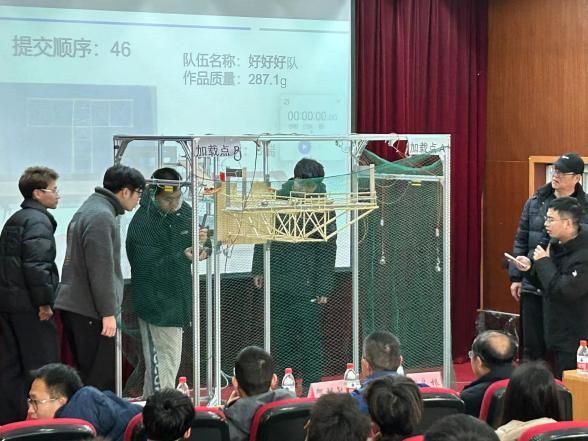 大赛由贺智敏老师主持并致开场辞,胡良根老师代表学校发言并宣布比赛正式开始。加载测试前,专家组组长郑荣跃老师介绍加载方法和竞赛规则,各组派代表介绍自己参赛模型,并回答专家组老师的提问,然后由技术顾问指导学生进行加载。这是结构设计竞赛最精彩的部分,当选手们紧张的按下按钮,加载成功时的欢笑声与掌声,模型崩塌时的惊呼声与叹息声,都将比赛的氛围推至高潮。无论成功与失败,每个模型经过参赛选手和专家组对模型结构的深入探讨,一同探寻结构与力的合理性,大家都感觉收获颇丰。