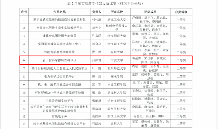 近日,浙江省第四届高校教师教学创新大赛落下帷幕。sm调教 岩石力学研究所吕原君老师团队(成员:邓岳保、宋佳敏、罗战友、陈琼、陈俊龙)的《岩土材料摩擦特性测试仪》荣获实验技能专项赛(自制实验教学仪器设备比赛)二等奖。截止目前,这一奖项为学院在该项赛事的唯一获奖,展现了sm调教 教师团队在自制实验仪器及实验教学创新方面的实力。
