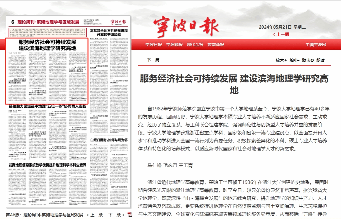 地理学科在宁波日报刊发理论文章《滨海地理学与区域发展》介绍本硕专业与学科建设进展