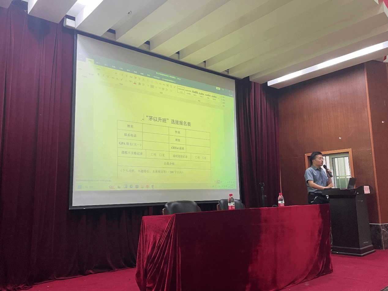 随后,党委委员贺智敏老师详细介绍了“茅以升班”的培养管理细则,包括选拔机制、培养机制以及培养细则的具体内容。他强调了“好中选优,宁缺毋滥”的选拔原则,以及“滚动培养机制”的重要性,确保班级成员始终保持高标准的学术表现和科研能力。