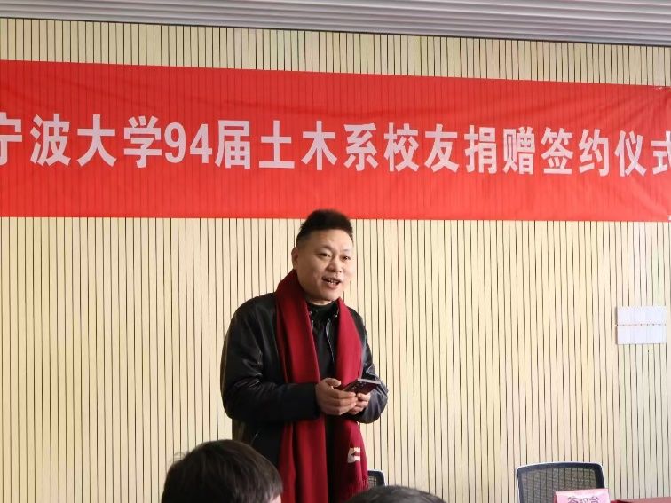 时任班长郑宏伟校友发表了感人至深的发言。他深情回忆了在母校度过的美好时光,感谢母校和老师们对大家的培养。他表示,此次捐赠是他和94届土木系校友们对母校的一份心意,希望能够对助力优秀学子成长成才尽一份绵薄之力。