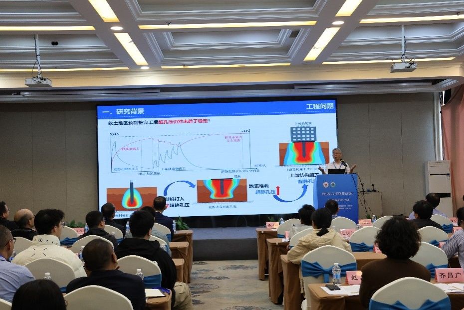 上午的专题报告聚焦“滨海软土地基处理(排水固结)”。浙江大学梅国雄教授作了题为《透水管桩“一桩四用”——承载、排水、换能和抗浮》的报告。他从研究背景、研究现状、创新构想和研究进展等方面进行阐述。透水管桩技术将控制沉桩挤土效应及加速超孔压消散的方法耦合,可提升工程效率并节省工程造价,是一种主动、高效、资源节约导向的桩基施工与地基处理工法。该技术可结合浅层地热能开采,实现水桩直接换热;还可以结合主被动联合抗浮,实现抗浮安全与经济的统一,是一种具有较好发展潜力和广阔应用空间的新型技术。