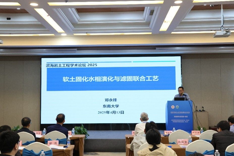 东南大学邓永锋教授的报告主题为《软土固化水相演化与滤固联合工艺》。他介绍了软土固化中水相形态的演化规律及其对强度的影响,提出基于自由水的统一强度表征方法,并开发了固废基固化剂设计体系。此外,团队创新的滤固联合工艺结合固结与固化技术,显著提升了软土的强度与稳定性。研究成果为沿海地区软土地基处理提供了理论支持与技术指导,在工程应用中展现出重要价值,助力解决复杂地质条件下的地基加固难题。