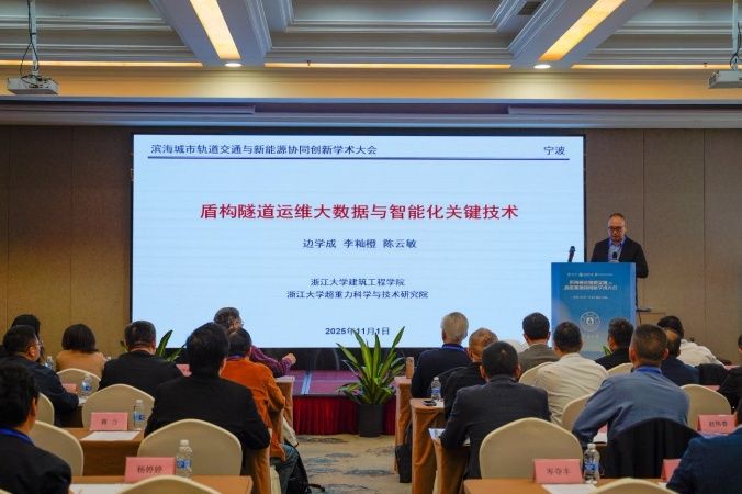 在随后进行的主题1特邀报告环节,聚焦“滨海城市轨道交通数智化协同创新”,多位专家分享了智慧轨道、智能运维、数字孪生技术、大数据分析及人工智能在轨道交通规划、建设、运营与管理中的最新研究成果与实践经验,探讨了数智化技术如何提升滨海城市轨道交通系统的安全性、效率与服务品质。报告包括浙江大学边学成教授的“盾构隧道运维大数据与智能化关键技术”、同济大学张冬梅教授的“机器学习赋能盾构隧道结构沉降变形预测方法研究”、浙大城市学院魏纲教授的“基坑开挖对邻近地铁盾构隧道的影响与控制研究”、浙江省建筑设计研究院刘兴旺正高级工程师的“软弱土地铁隧道径向水泥土桩加固技术(TJS工法)新进展”,以及宁波市轨道交通集团有限公司姚燕明正高级工程师的“宁波至慈溪市域(郊)铁路工程零距离下穿既有运营车站(U-BIT)方案”。