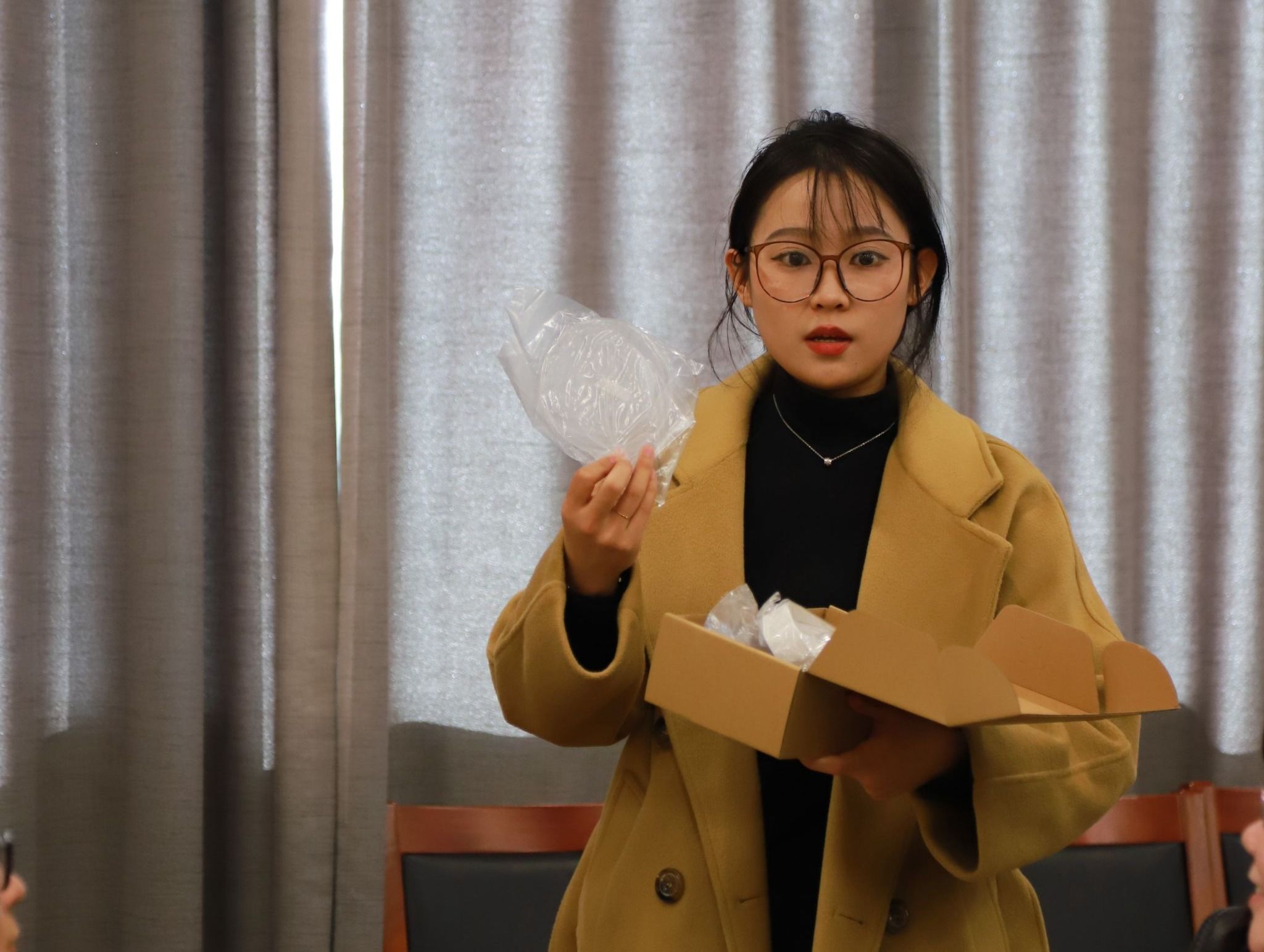专职辅导员曹佳妮老师介绍了学院精心准备的考研加油包,其中包含暖手宝、耳塞、学习文具和印有院徽的LED发光笔筒等实用物品。她指出这份加油包,是学院对考研学子们最暖心的陪伴,希望能为大家点燃冬日考研的热情,点亮通往星辰大海的前行之路。
