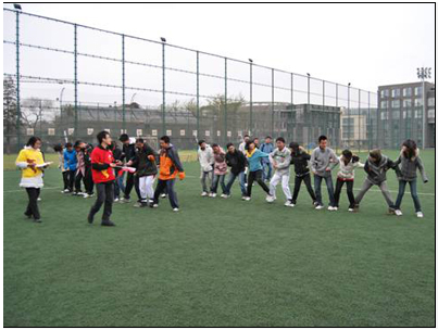 A、所有的参赛队员按男女交替站成肩并肩的一排,然后用短绳子将相邻队员的脚踝绑在一起,然后整体侧向移动30米,比如:以全部队员面向西为例,那么整体移动的方向为南;