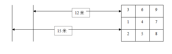 (4)场地设置:起掷点距落地区的距离女运动员为12米,男运动员为15米。落地区为正方形方格,方格内分9个区域,每个区域长、宽均为0.5米(见下图)。