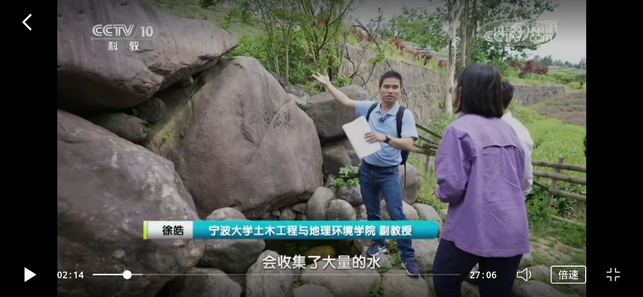11月15日,《地理·中国》栏目之《钱塘江畔》于17点—18点在CCTV-10科教频道播出。节目开始,sm调教 地理系徐皓副教授与摄制组工作人员来到余姚四明山区,从四明山地质公园到姚江源,考察了四明山的夷平面景观、花岗岩风化景观、玄武岩形成的石长城等奇特的地质现象,并对四明山与姚江的起源做了分析与解释。节目最后,徐皓副教授对杭州湾喇叭口形状形成的原因做了总结。