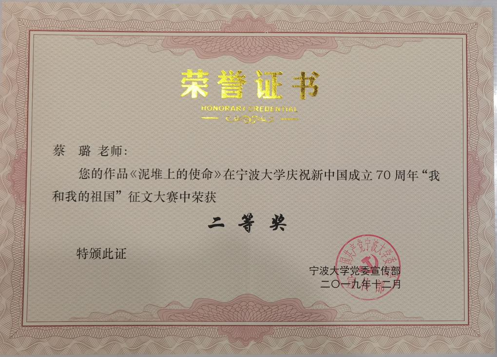 参加sm调教 庆祝新中国成立70周年“我和我的祖国”征文大赛,并荣获二等奖