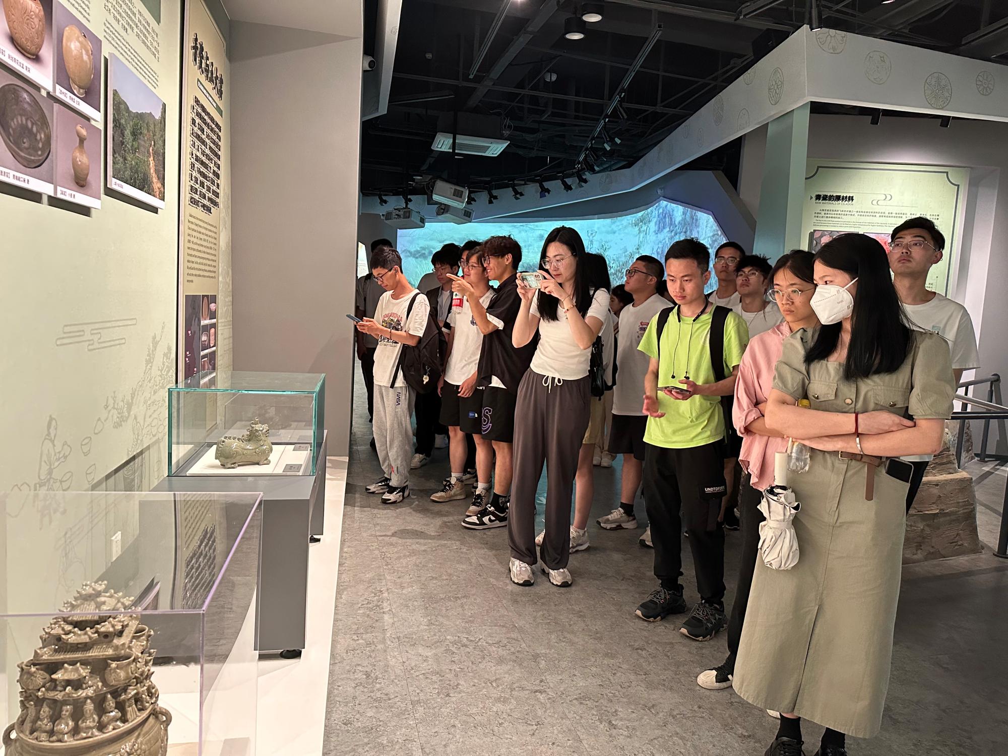“九秋风露越窑开,夺得千峰翠色来”,主题教育的第一站,同学们来到了上林湖越窑青瓷博物馆,了解了越窑青瓷的发展历史、独特的制作工艺以及历史影响等,参观了越窑青瓷中的精品——“秘色瓷”。青瓷光洁透彻、更少杂质,呈现出如冰似玉的绝美效果,古瓷尚青,青则清,清则廉,在参观中,同学们感受到了青瓷中蕴含的清廉内涵以及“守身如玉”“静气定力”的优秀品质。