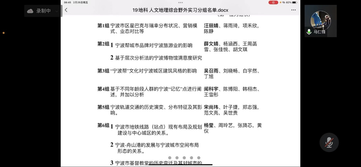 2022年2月25日上午,19级地理科学(师范)班全体同学在线上开展人文地理野外实习第一次会议,本次会议由马仁锋教授主持。