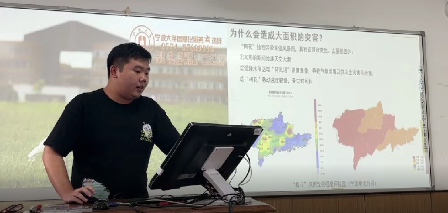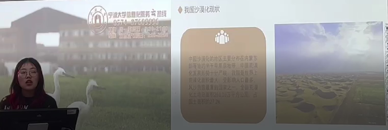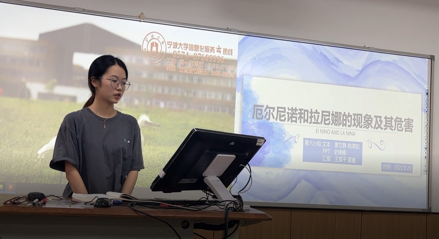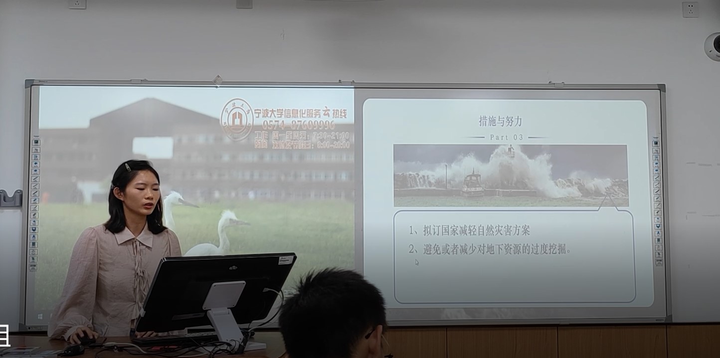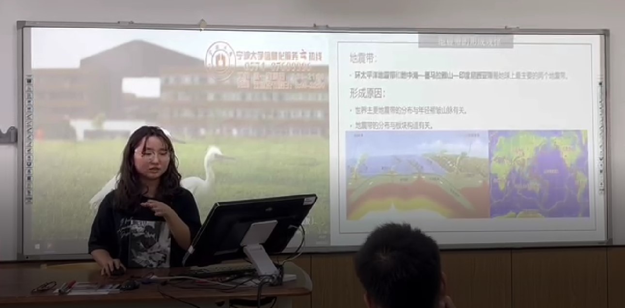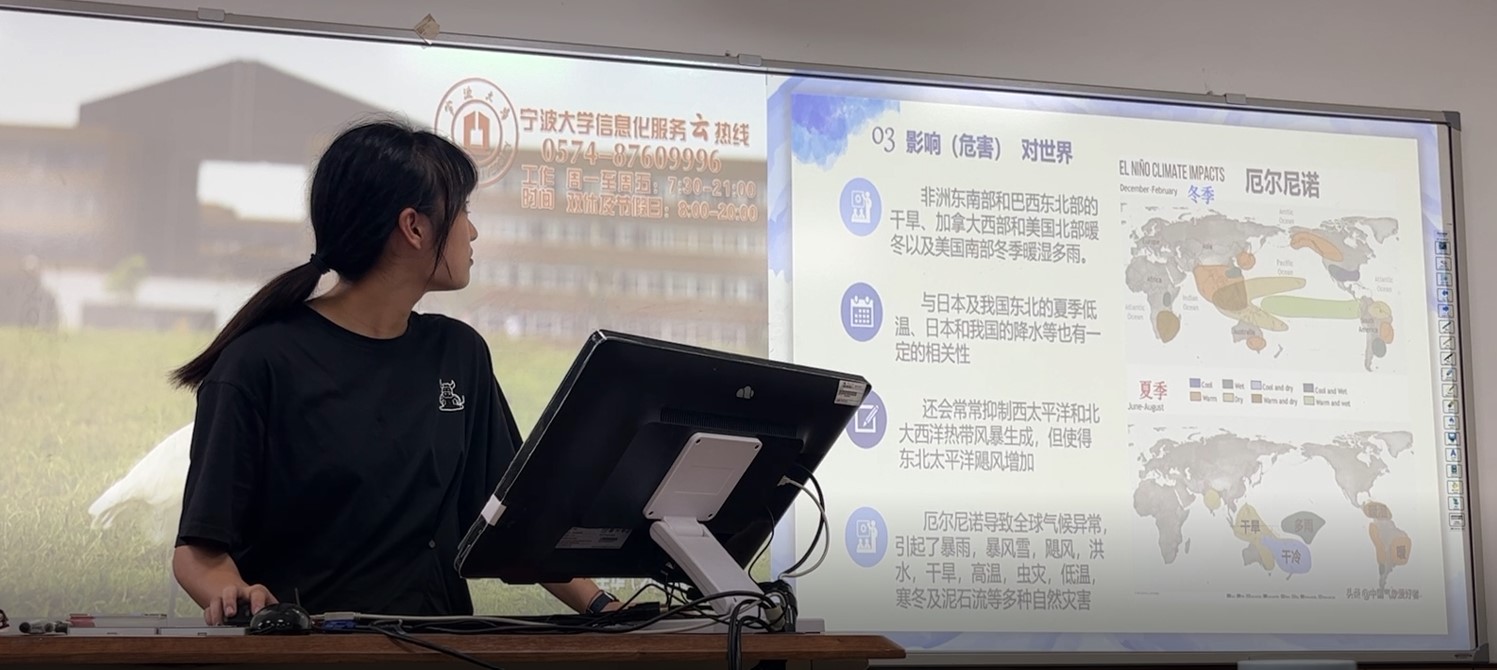 本节课程汇报旨在考核地理科学(师范)20级班学生的自主探究区域自然地理的能力,汇报内容涉及《世界地理I》课程中的全球性自然灾害问题,探究主题主要有火山喷发引起的相关灾害、地震带活动引起的相关灾害、风灾、水旱灾害、厄尔尼诺与拉尼娜现象及其危害、沙漠化、极端天气等。班级同学按照学号有序分成8组,各小组负责一项主题研究,经过为期一周的讨论与探索后,在课堂上采用单人或多人汇报等多样的形式完成汇报任务。高梅香老师邀请其他同学点评,再提出相关建议,帮助学生进一步提升世界自然地理知识的认知和地理专业素养。