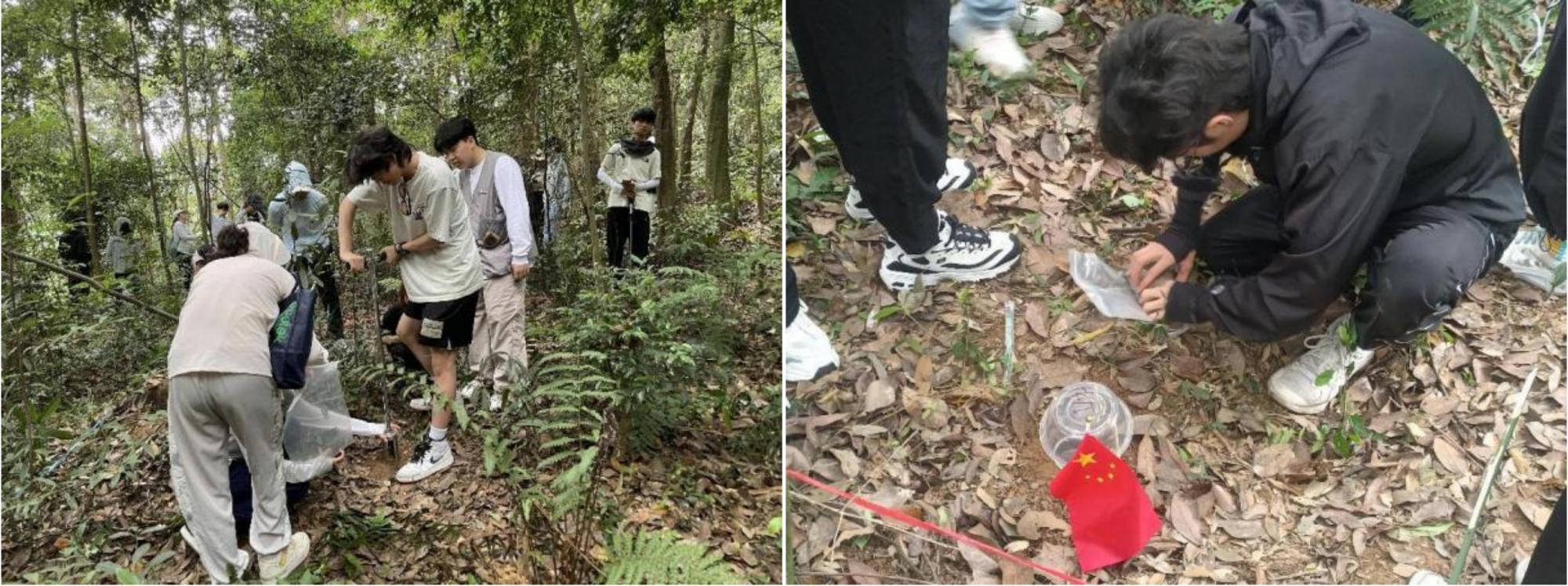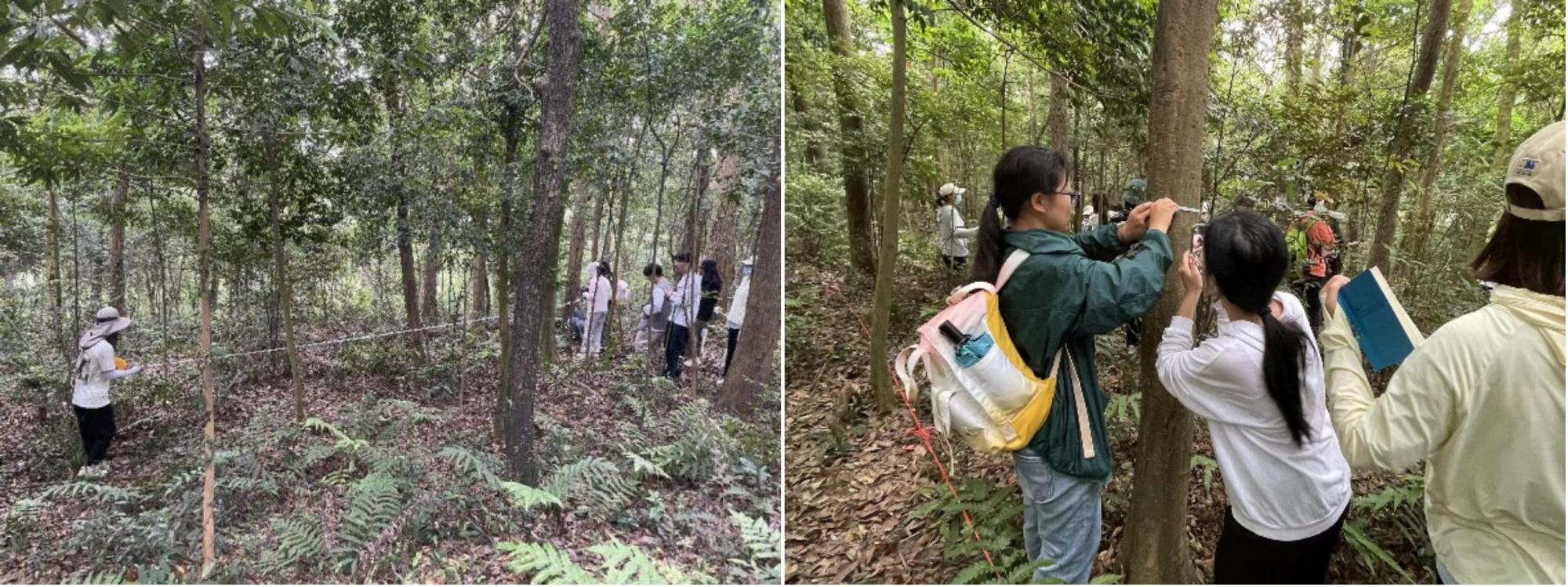 杨晓东老师介绍了天童主要植被的演替过程,带领同学们考察和比较分析了不同演替阶段的植被群落,讲解了样地设置和调查的方法。高梅香老师介绍了天童主要的土壤类型、土壤剖面特征,讲解了如何采集土壤样品和土壤动物样品。之后在老师的指导下,同学们以小组为单位设置20米×20米样地,并开展了每木调查和群落分析,包括植被树高、胸径、基径、盖度与植被丰富度、密度等参数。同学们认真听讲、相互合作并顺利完成了相关任务。