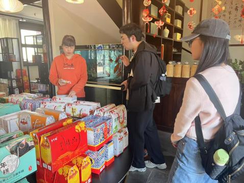 第一组成员在府前路历史文化街区进行了五次访谈,大致对商业街的业态、消费者的偏好进行了了解。作为第一批入选省非物质文化遗产主题街区,该街区商铺众多,店铺装修传统韵味十足,同类店铺特色各不相同。管理方还将非遗资源通过多元化方式转化成可体验、可分享、可消费的文旅元素,举办阳明古镇国潮节、戏曲专场演出等多项活动,其传统感和烟火气引人神往,吸引了来自五湖四海的游客。