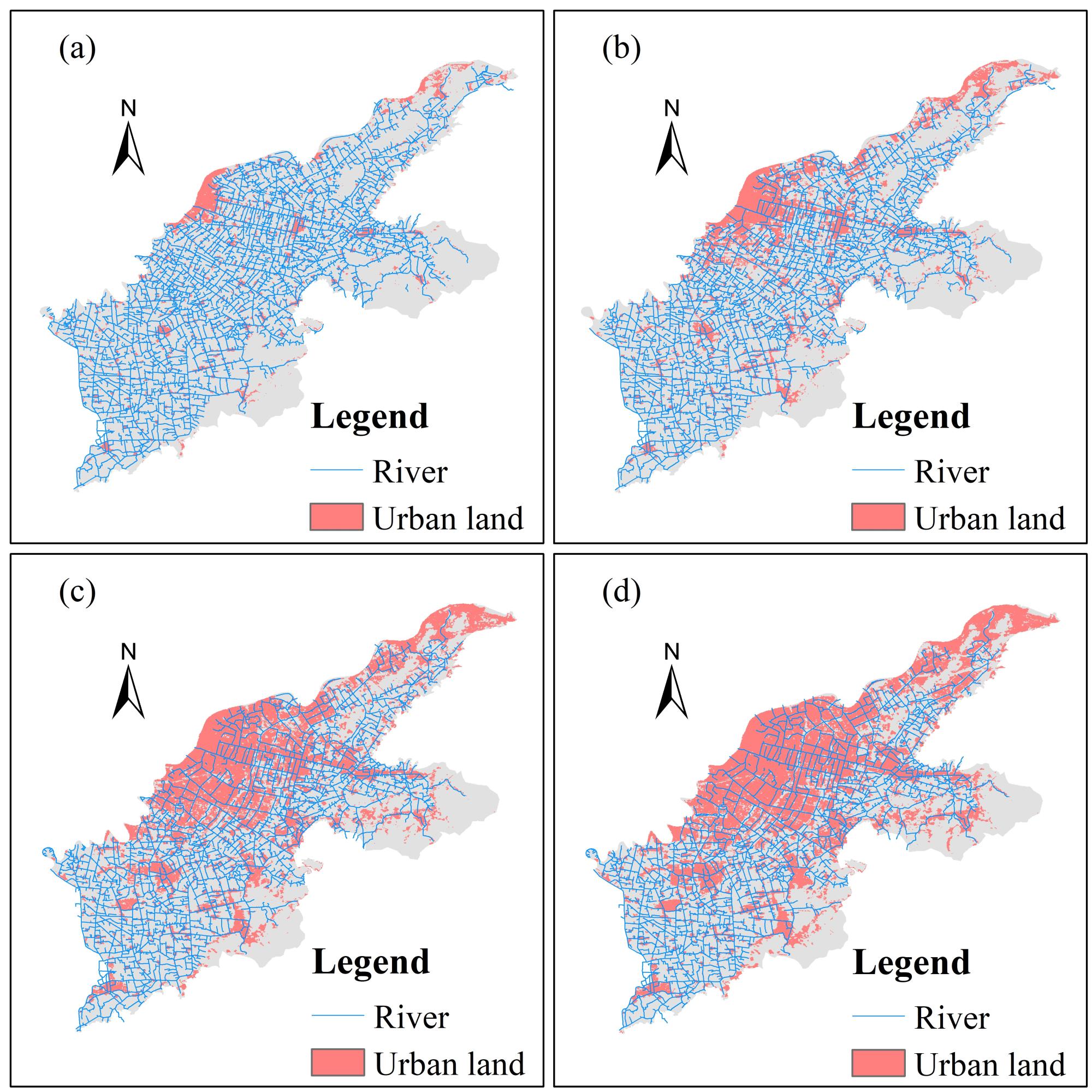 图2 1990s、2000s、2010s、2020s鄞东南平原区城镇用地和水系空间分布格局