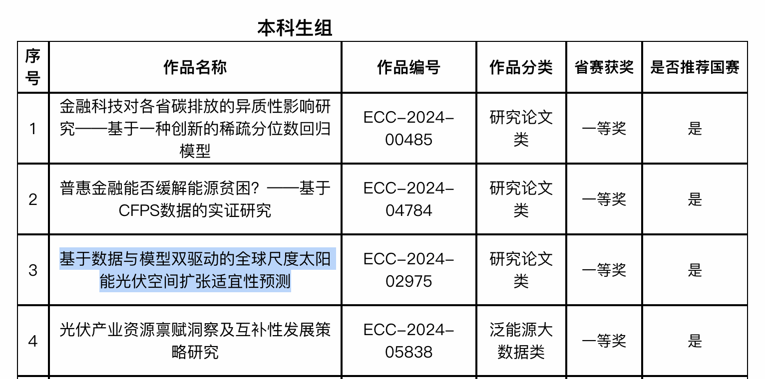 地理系队伍从众多队伍中脱颖而出,《基于数据与模型双驱动的全球尺度太阳能光伏空间扩张适宜性预测》作品获得本科生组省一等奖的好成绩。