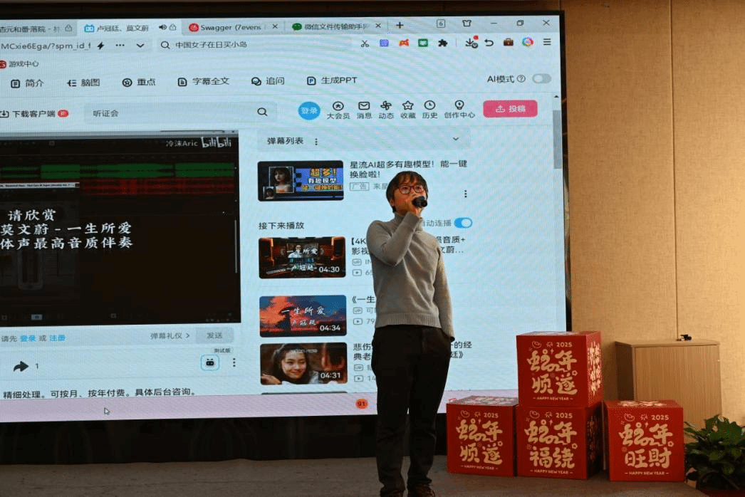 接下来的茶话会节目丰富多彩、高潮迭起,为大家带来了一场视听和情感的盛宴。地理系老师们带来的方言版《再别康桥》,用别具一格的方言演绎经典诗词,令全场耳目一新,掌声雷动。姚宇峰等老师带来的《太极拳》表演动作优雅、富有哲理,赢得了观众一致好评。陈霞老师带来独特的《左手镜像书法》表演,书写下“基金稳拿 逢投必中”的祝福。学工办徐晓宇老师深情演绎歌曲《一生所爱》,以温暖的旋律打动了在场每一位观众,为活动增添了一份浓厚的情感共鸣。