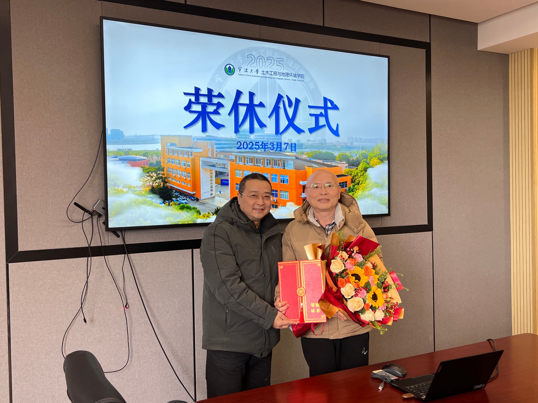 此次荣休仪式在学院A408举行,仪式由学院副院长章子华主持、分工会主席叶春阳以及土木系教师代表共同见证了这一重要时刻,整个现场洋溢着对应老师的深厚情感和美好祝愿。仪式伊始,章子华副院长回顾了应永法老师在学校工作期间的点点滴滴。随后,分工会主席叶春阳向应老师敬献了鲜花及证书,以此表达对应老师的感激与敬意。