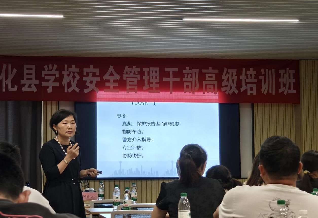 李正云老师从心理辅导的视角来阐释学校心理危机实施管理,讲到作为学校安全管理干部要提前识别学生危机,早干预,摸清状况及相关原因,积极与学生沟通。她分享了她所处理的一件校园自杀事件,通过这次事件她强调学校安全管理者在面临危机时要找准问题关联主体,及时向领导汇报,领导要调集更多的资源来应对风险,给予老师更多帮助,采取一切手段降低风险。当面对学生向老师报告某学生可能做危险事情时,老师应当要保持冷静,调查事情背景,同时做好报告学生的保密工作,维护学生对老师的信赖。此外,良好的家庭关系对青少年的心理健康成长占有非常重要地位,要做好校内与校外的联动,共同打造友好校园。