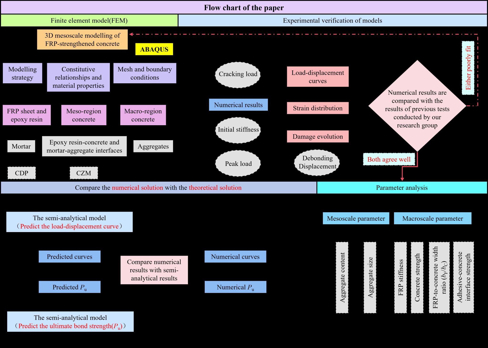 外贴FRP片材(布或板)是目前混凝土结构加固的主要方法之一。混凝土的细观结构(包含骨料分布与组分特性)会显著影响FRP与混凝土界面黏结强度及脱粘过程,然而该过程的细观尺度建模与观测仍具挑战性。本文提出了一种三维细观有限元模型,用于模拟FRP布与混凝土基体间的脱粘过程。通过基于随机骨料分布的网格预生成算法构建混凝土细观结构,并在多相异质材料界面设置内聚力单元。采用混凝土损伤塑性(CDP)模型和内聚力(CZM)模型分别表征砂浆基体与异质界面的力学行为。通过试验数据、数值模拟与半解析解的对比验证了所建模型的可靠性,并开展参数化研究量化骨料含量与粒径、FRP刚度、混凝土强度、FRP-混凝土宽度比(bF/bC)及黏结剂-混凝土界面强度的影响规律。结果表明:当黏结长度超过有效长度时,FRP-混凝土界面极限黏结强度随FRP刚度增加而提升,否则主要受控于混凝土强度;当混凝土宽度(bC)超过临界阈值后,宽度比对极限黏结强度的影响可忽略;为确保FRP加固的有效性,黏结剂-混凝土界面强度须达到临界值以保证FRP向混凝土的应力传递。相关研究成果发表在国际结构工程领域顶级期刊《Engineering Structures》(SCI, JCR Q1,中科院1区, TOP, IF = 5.6)。